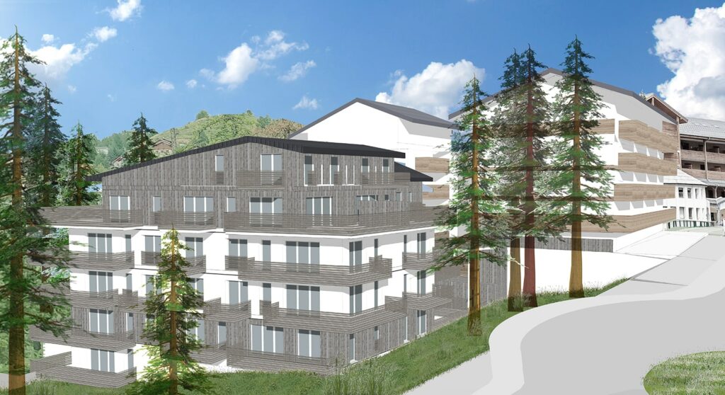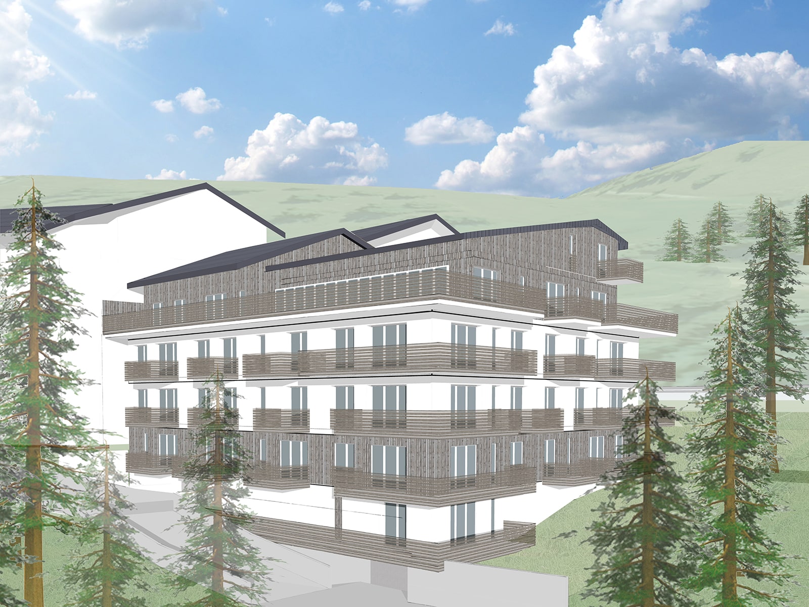 Sur la façade avant, une passerelle piétonne donne accès directement aux pieds des pistes. Les appartements sont généreux et possèdent tous une terrasse offrant de belles vues sur le paysage proche et lointain.