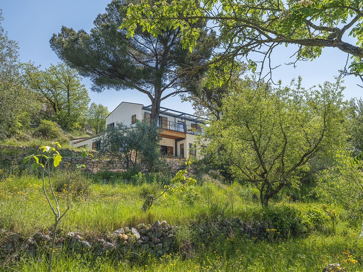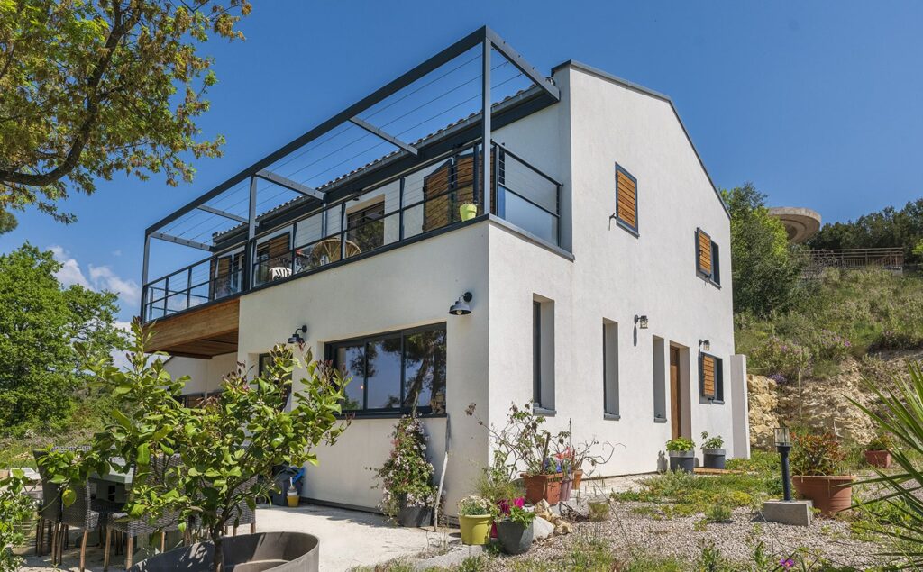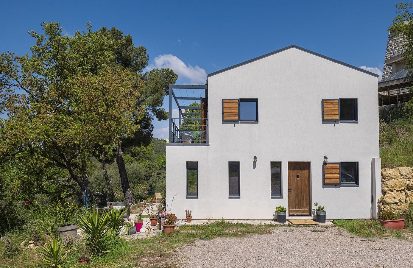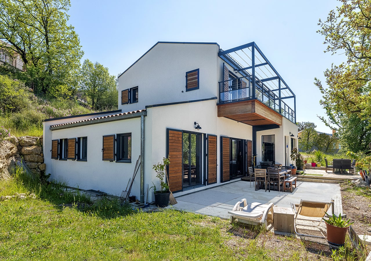 La présence d’un porte-à-faux avec une poutre bois apparente, l’installation d’une pergola, de menuiseries en aluminium gris anthracite ainsi que les volets bois avec un encadrement alu, participent à l’écriture contemporaine et à l’aspect naturel du projet favorisant son intégration en surplomb du jardin.