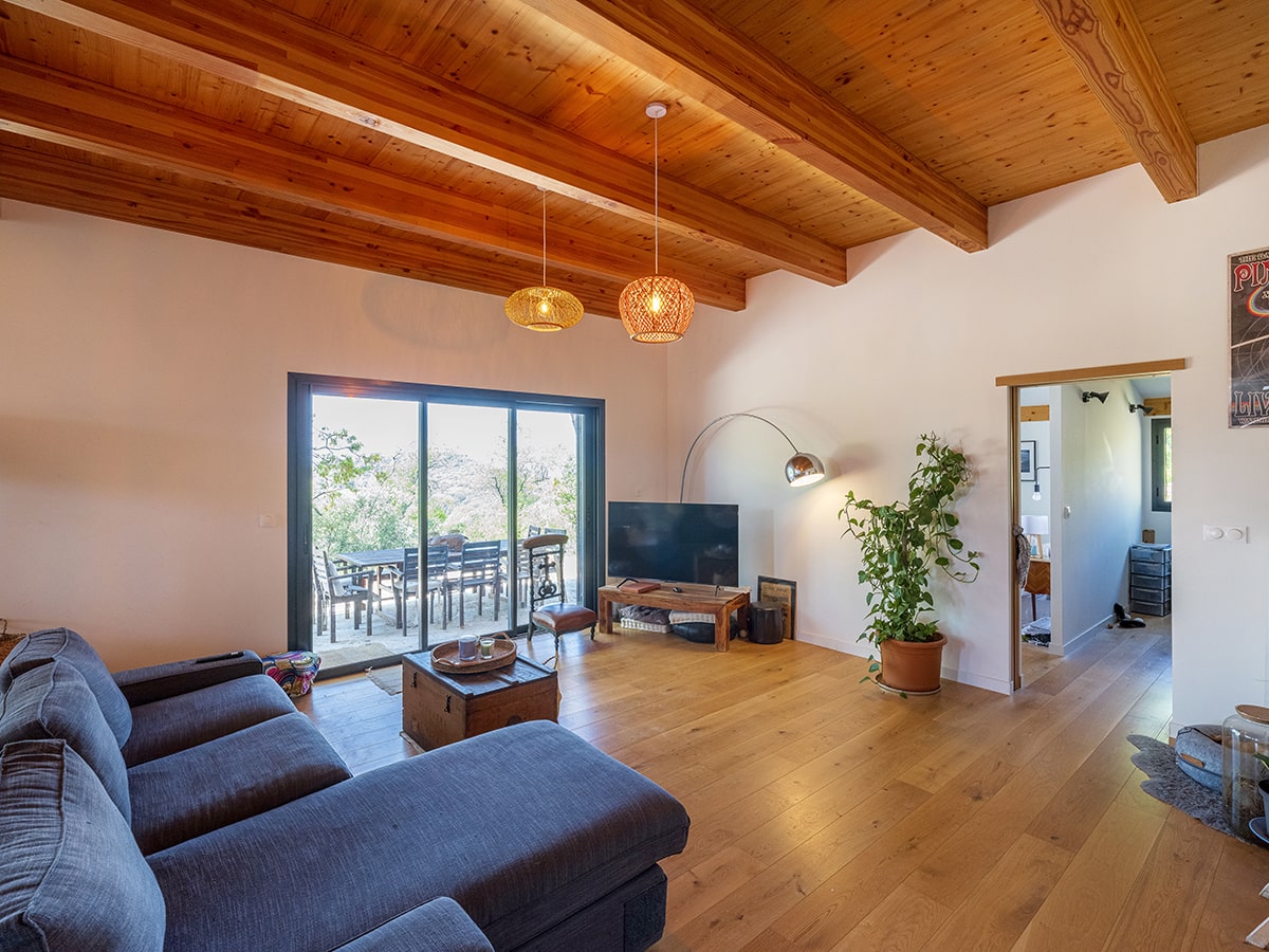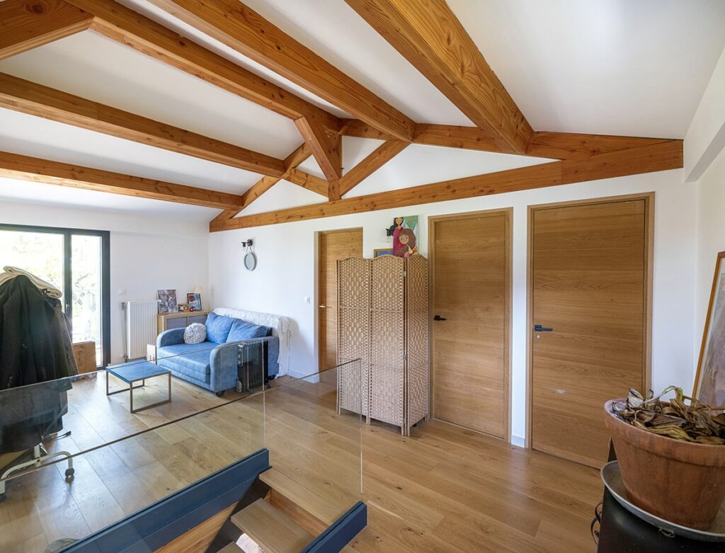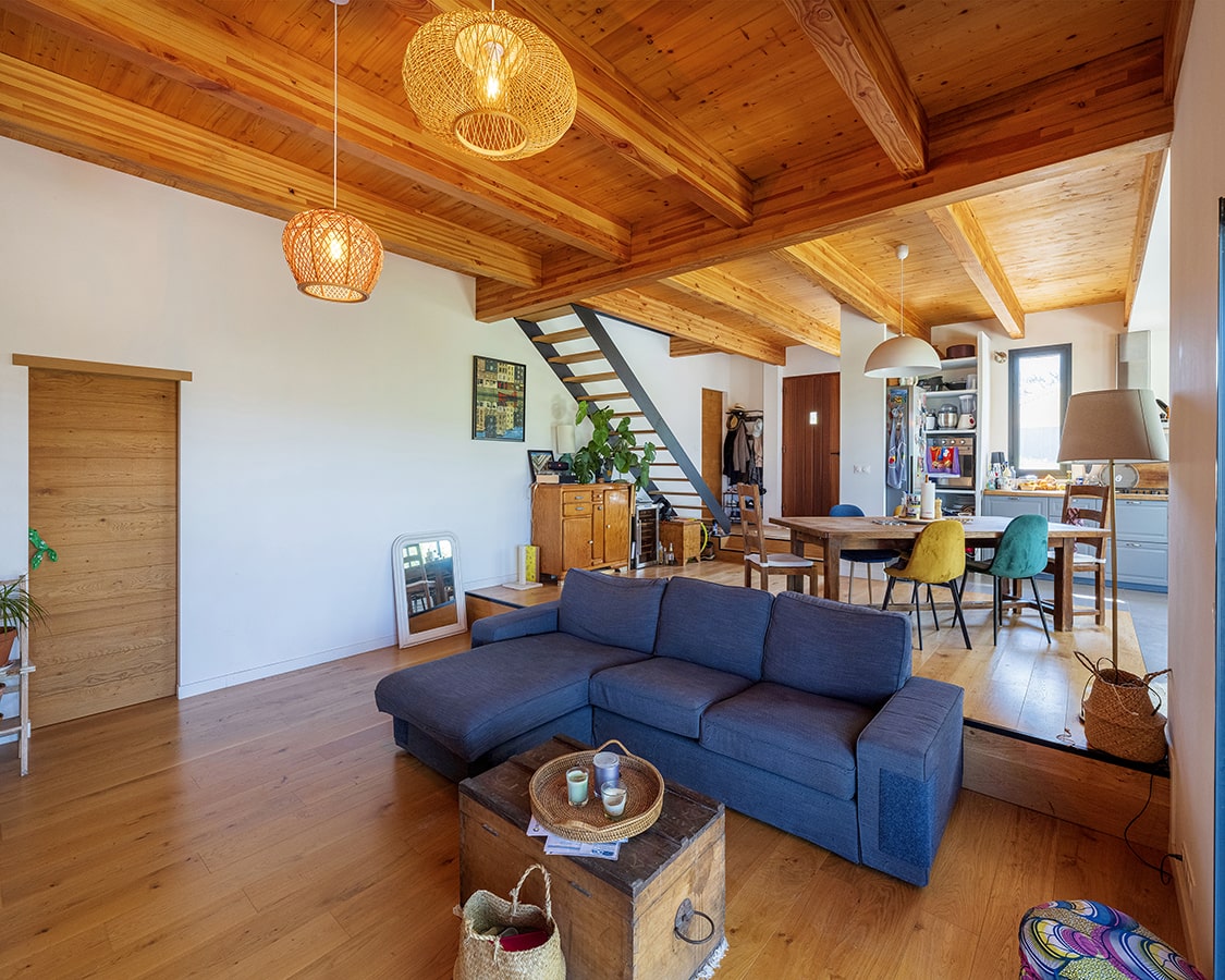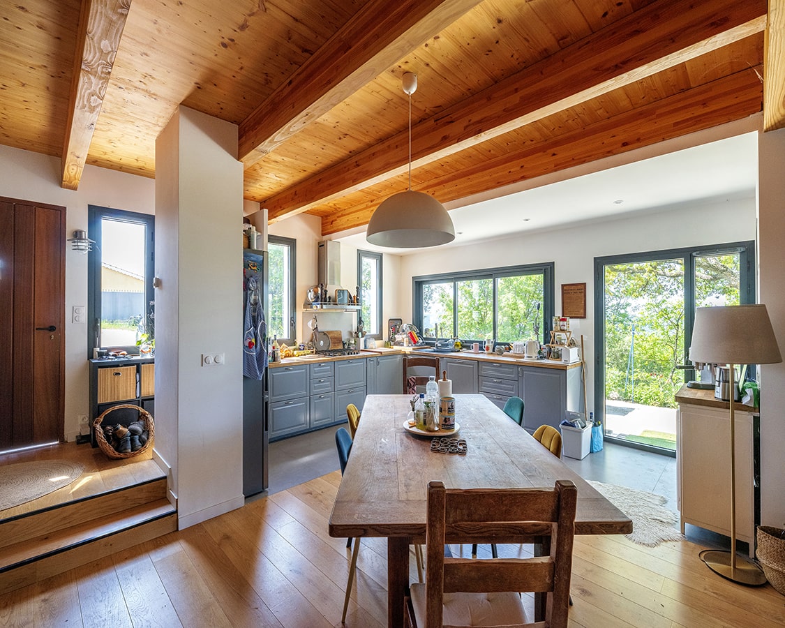 Le projet est réalisé en ossature bois, avec une isolation par l’extérieur recouverte d’un enduit. Ce choix structurel, au-delà de ses vertus environnementales, crée une ambiance intérieure chaleureuse, notamment par le choix de poutres bois apparentes et de panneaux bois 3 plis apparents en sous-face (plafonds des pièces de vie).