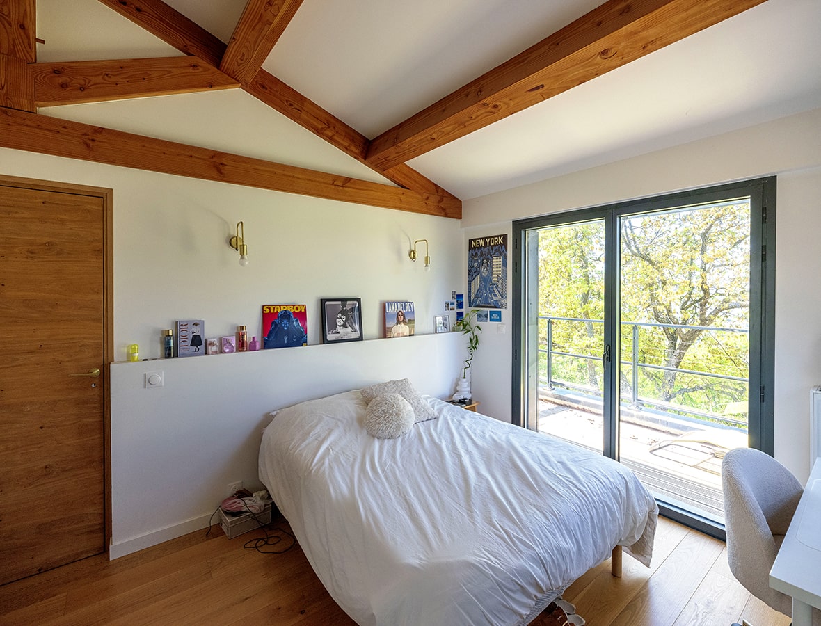 La présence de la charpente bois et les plafonds en rampant confèrent également un espace agréable et chaleureux dans les chambres.